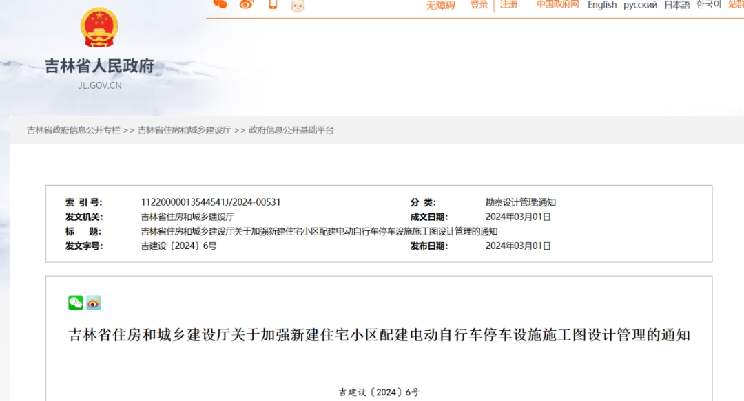近日,吉林省住房和城鄉建設廳網站發布關于加強新建住宅小區配建電動自行車停車設施施工圖設計管理的通知: